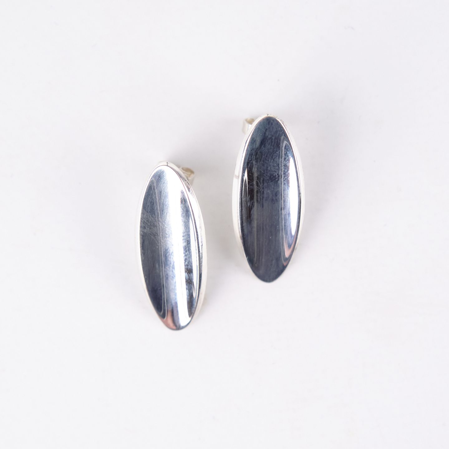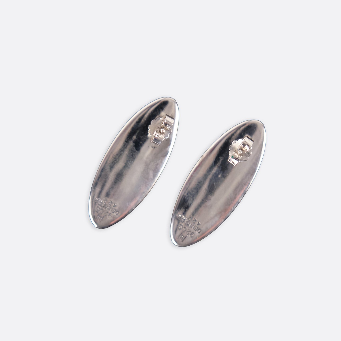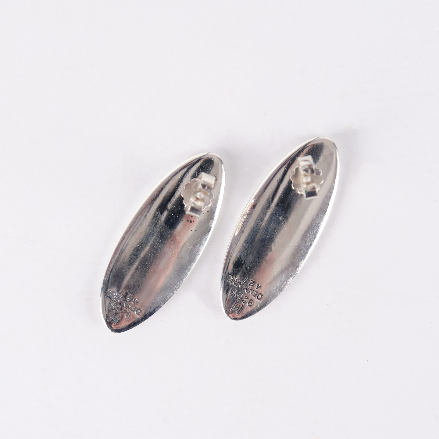 Ovale ørestikker i sterling sølv, model nr. 427, designet af Hans Hansen. Elegant, tidløst dansk smykkedesign med enkel organisk form, som kendetegner producentens moderne udtryk. Et klassisk sæt ørestikker i solid sølv.