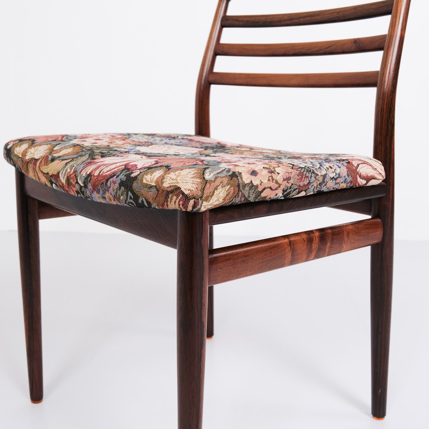 Set of six Erling Torvits dining chairs from the 1960s. Rosewood with floral seat. Sorø Møbelfabrik.