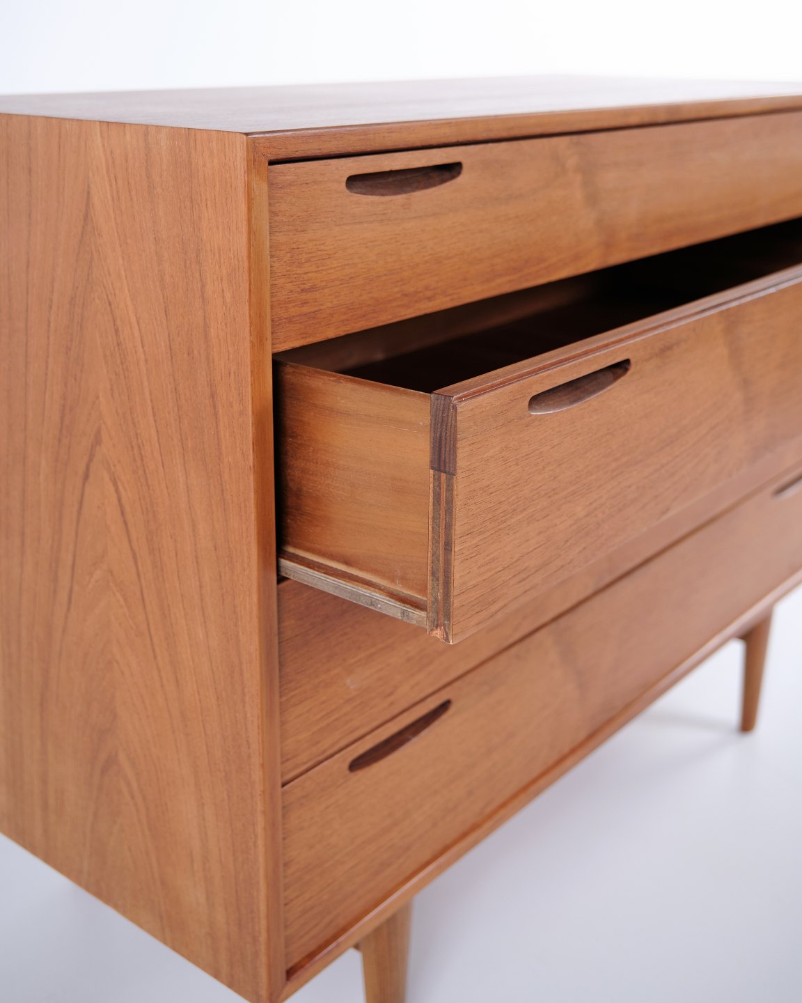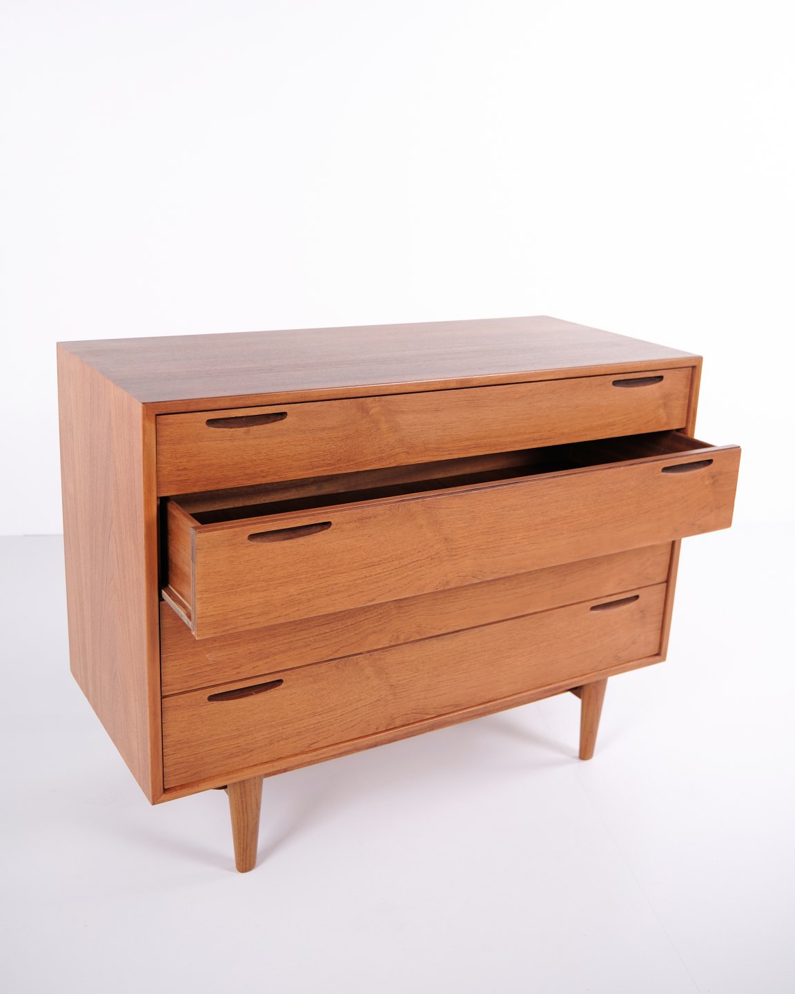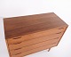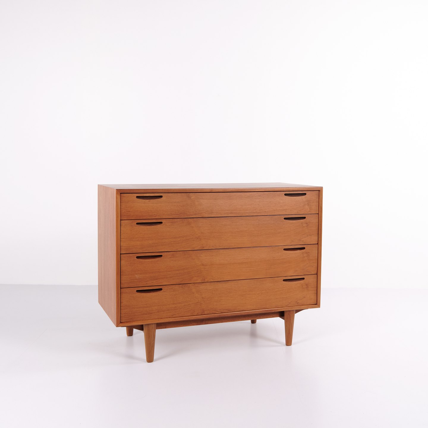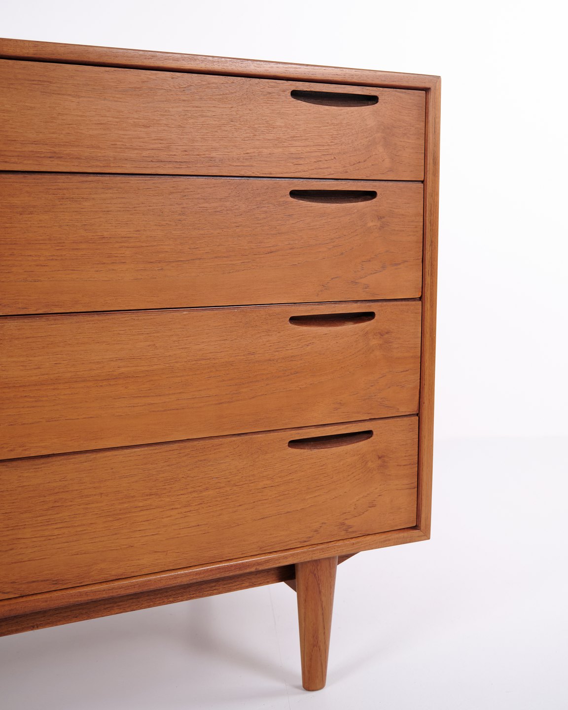 Chest of drawers designed by Ib Kofod-Larsen and manufactured by Brande Møbelfabrik in the 1950s. The chest of drawers is made of teak with four spacious drawers and characteristic, simple handles, which emphasize Kofod-Larsen's clean and functional design language.