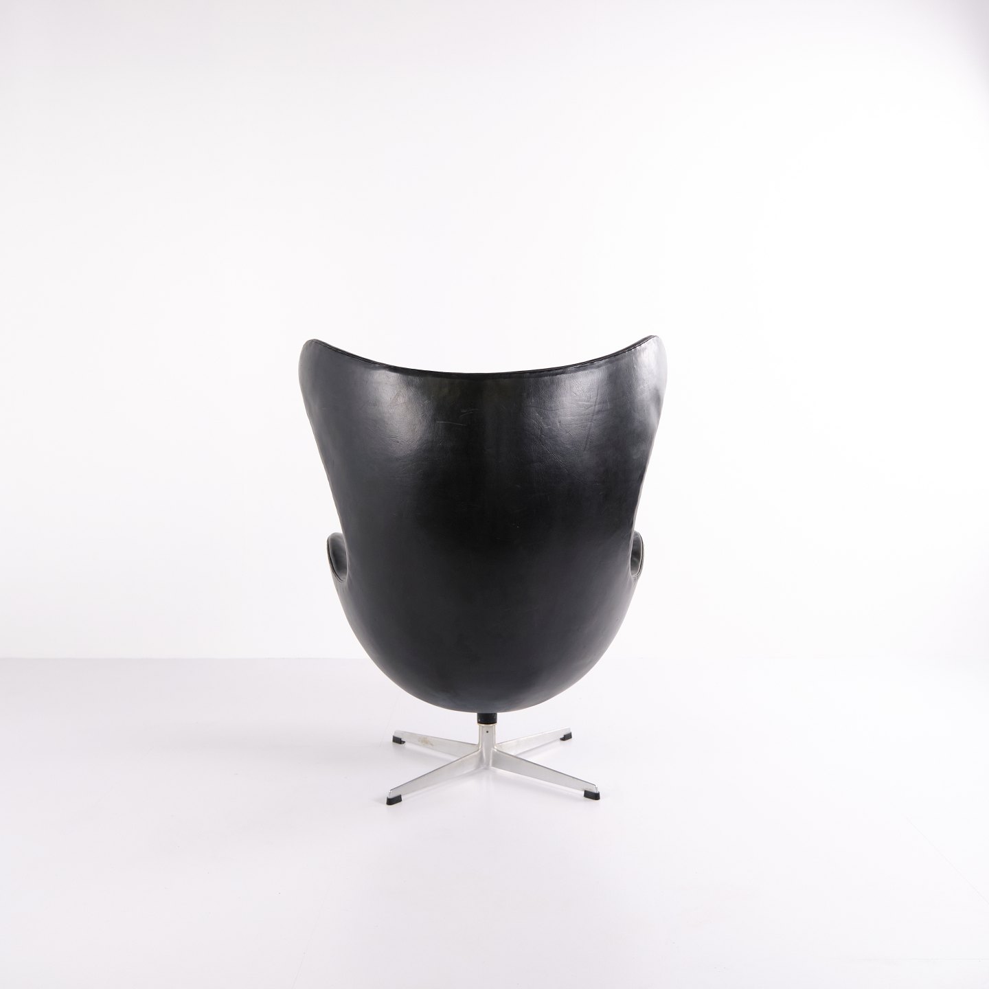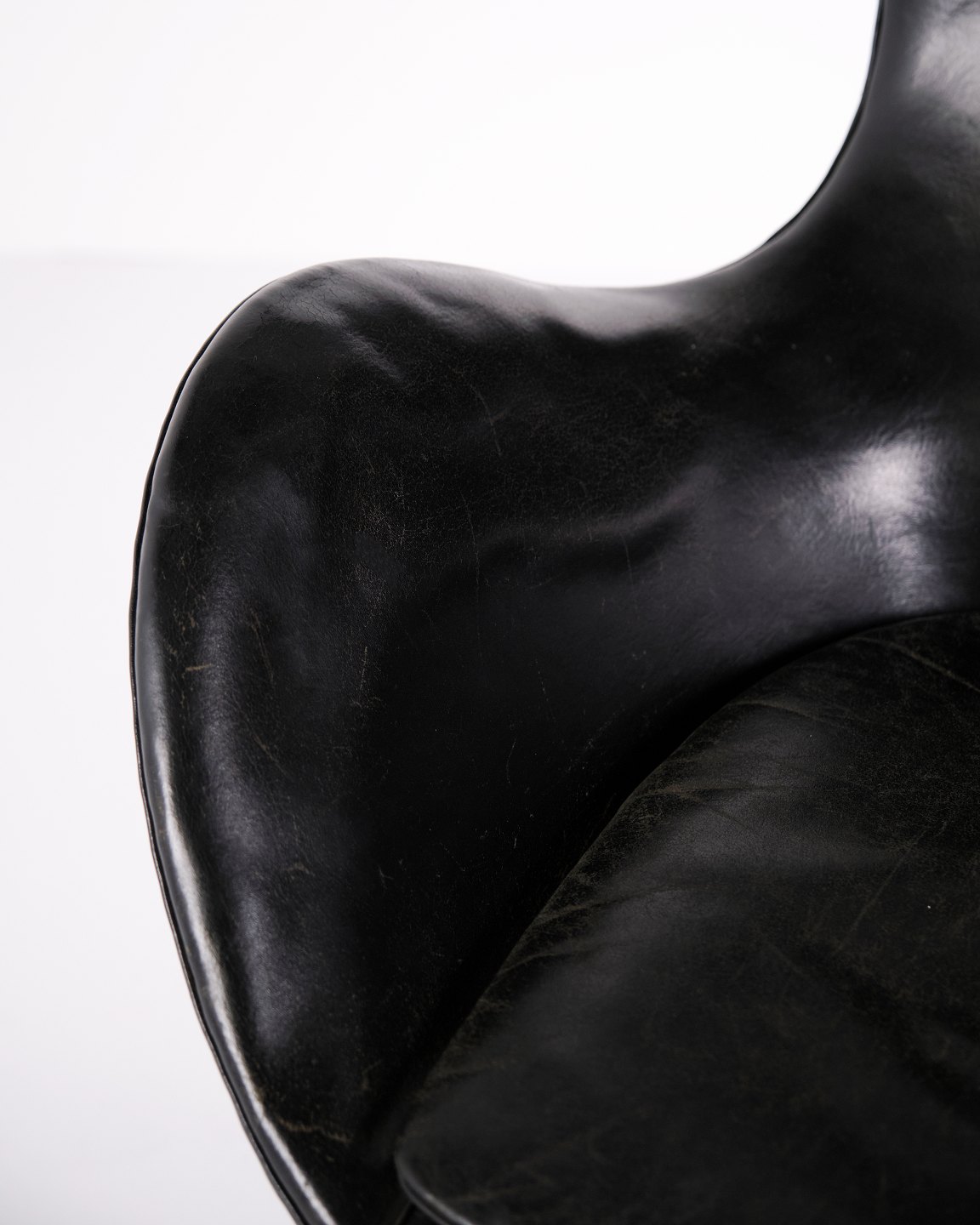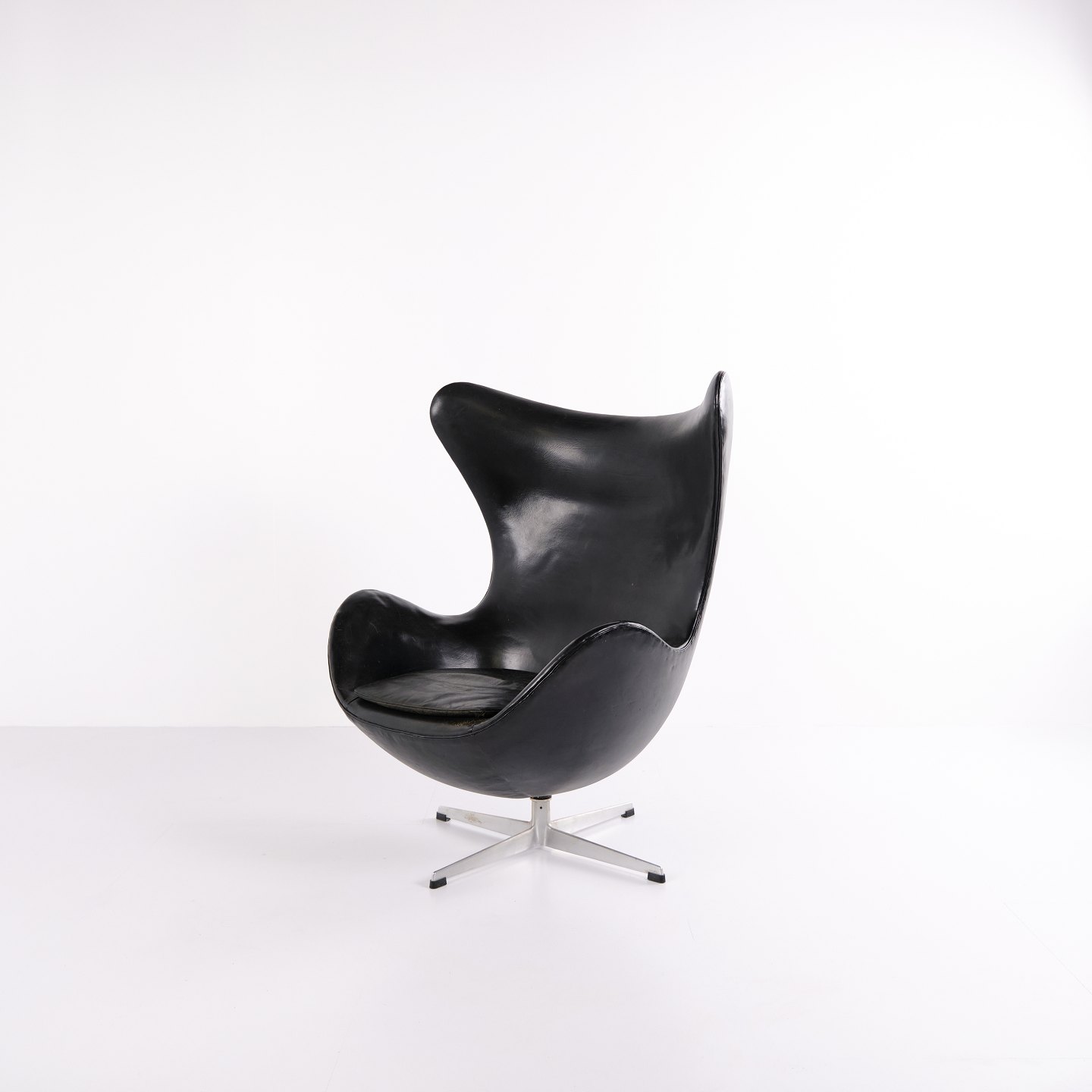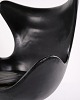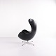 Please contact us for price informationEgg chair designed by Arne Jacobsen and produced by Fritz Hansen. Early model upholstered in black original leather and fitted with an aluminium base. A classic Danish design icon from an earlier production period, characterised by its organic shape and high-quality leather finish.