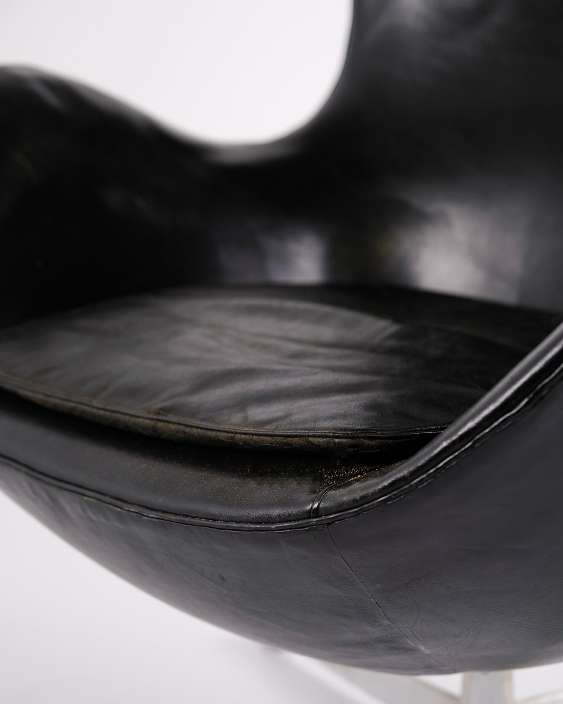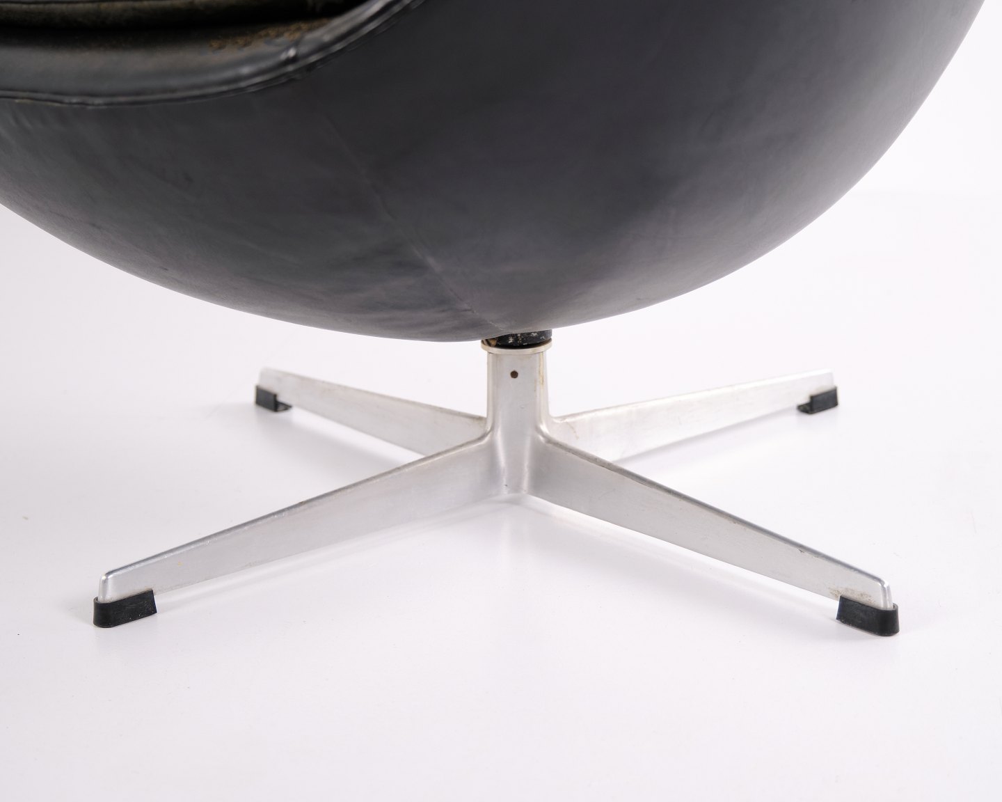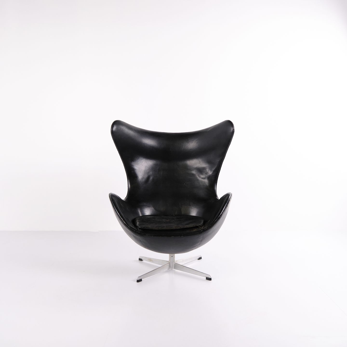 Please contact us for price informationEgg chair designed by Arne Jacobsen and produced by Fritz Hansen. Early model upholstered in black original leather and fitted with an aluminium base. A classic Danish design icon from an earlier production period, characterised by its organic shape and high-quality leather finish.