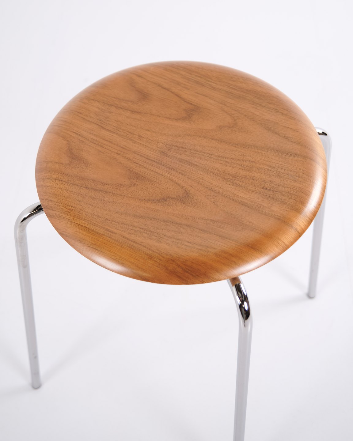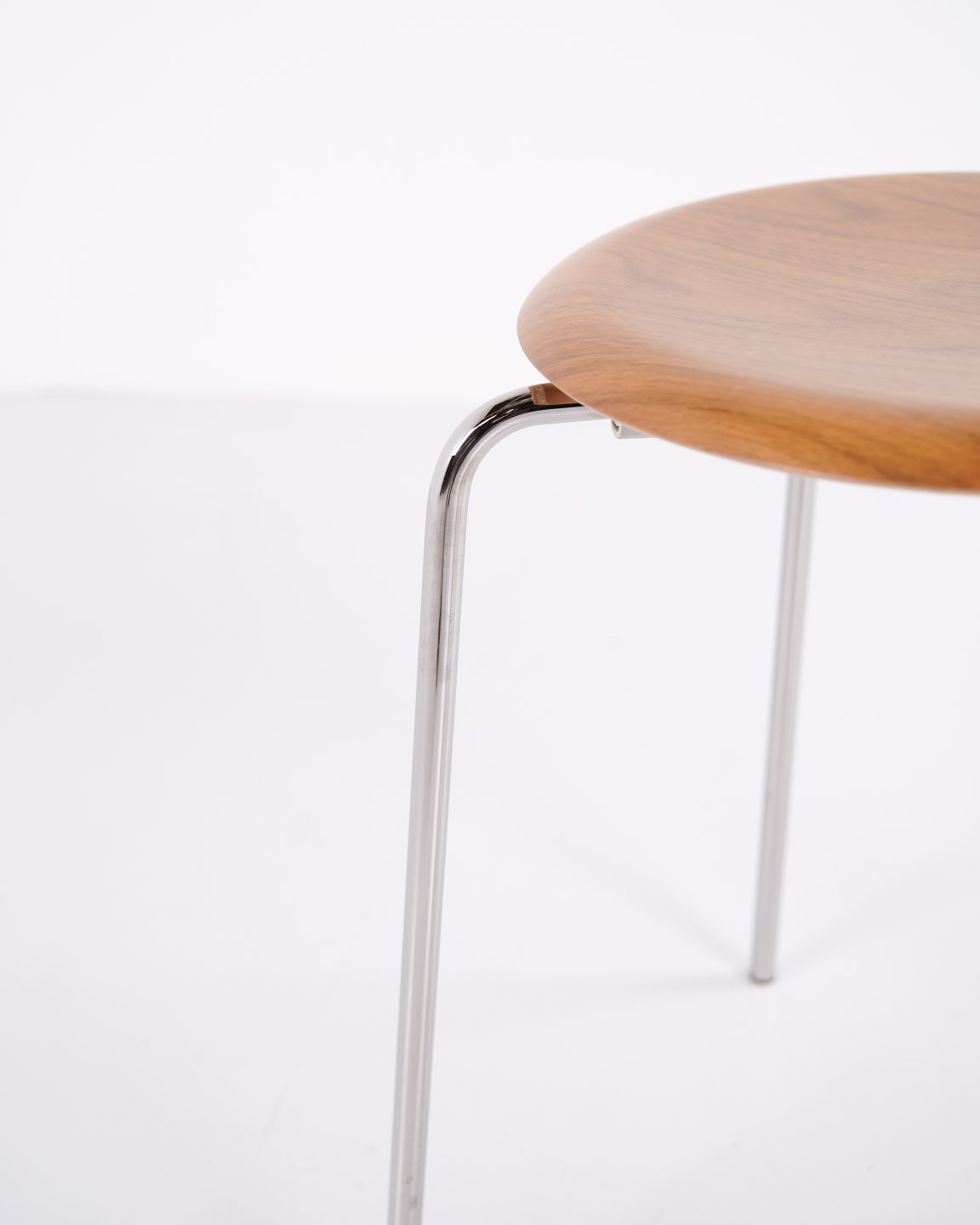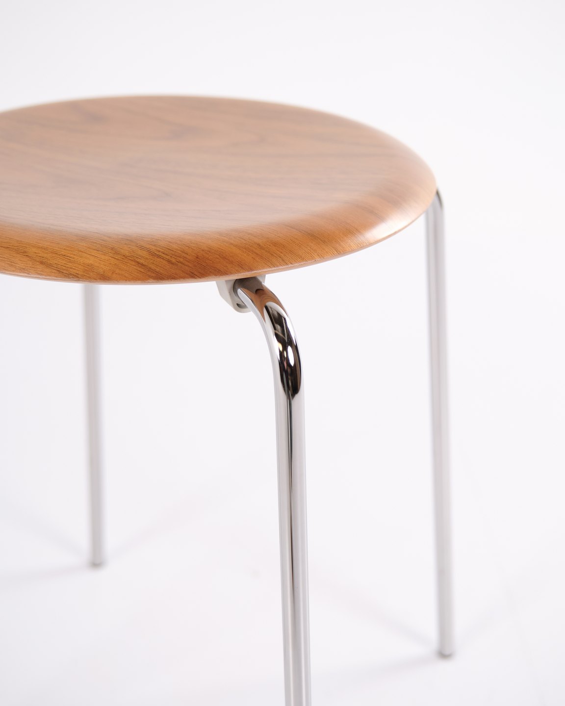 SoldDot stool designed by Arne Jacobsen, made in walnut veneer with a chrome-plated steel frame. A classic, lightweight stool suitable as extra seating or as a decorative design piece in the home.