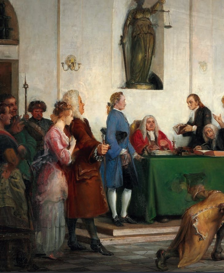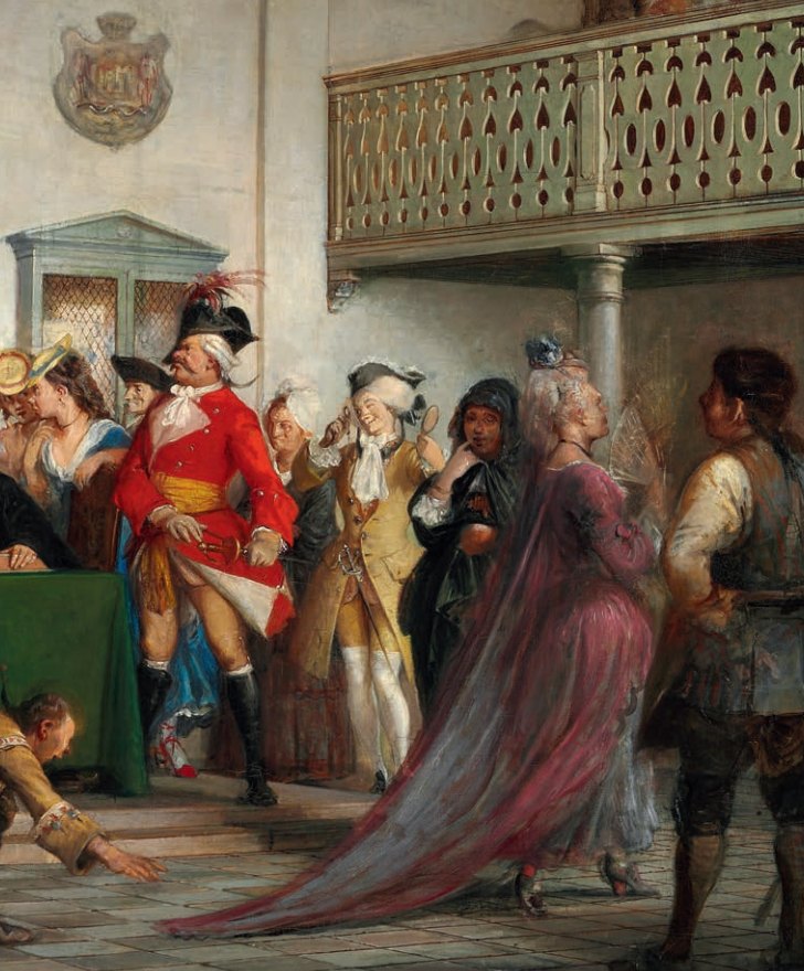 The painting shows the concluding courtroom scene in which Rosiflengius receives his sentence. He is condemned to wear the so-called “Spanish cloak”: a barrel with an opening for the head, placed over individuals who had caused public disorder, and used to expose them to ridicule as they were led through the streets. In Holberg’s comedy, Rosiflengius is punished for giving excessive and uncritical praise; his name literally means “praise-at-random”.