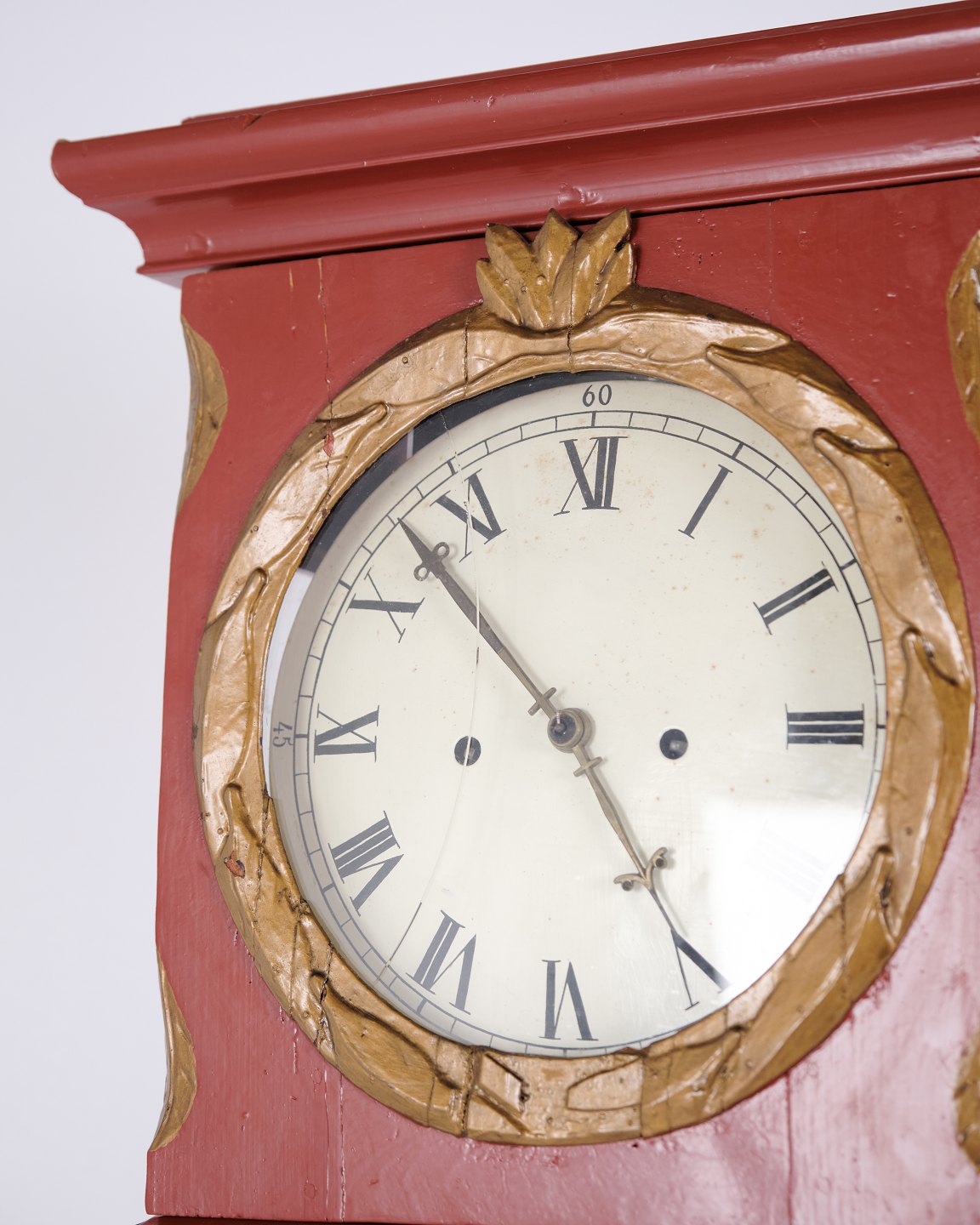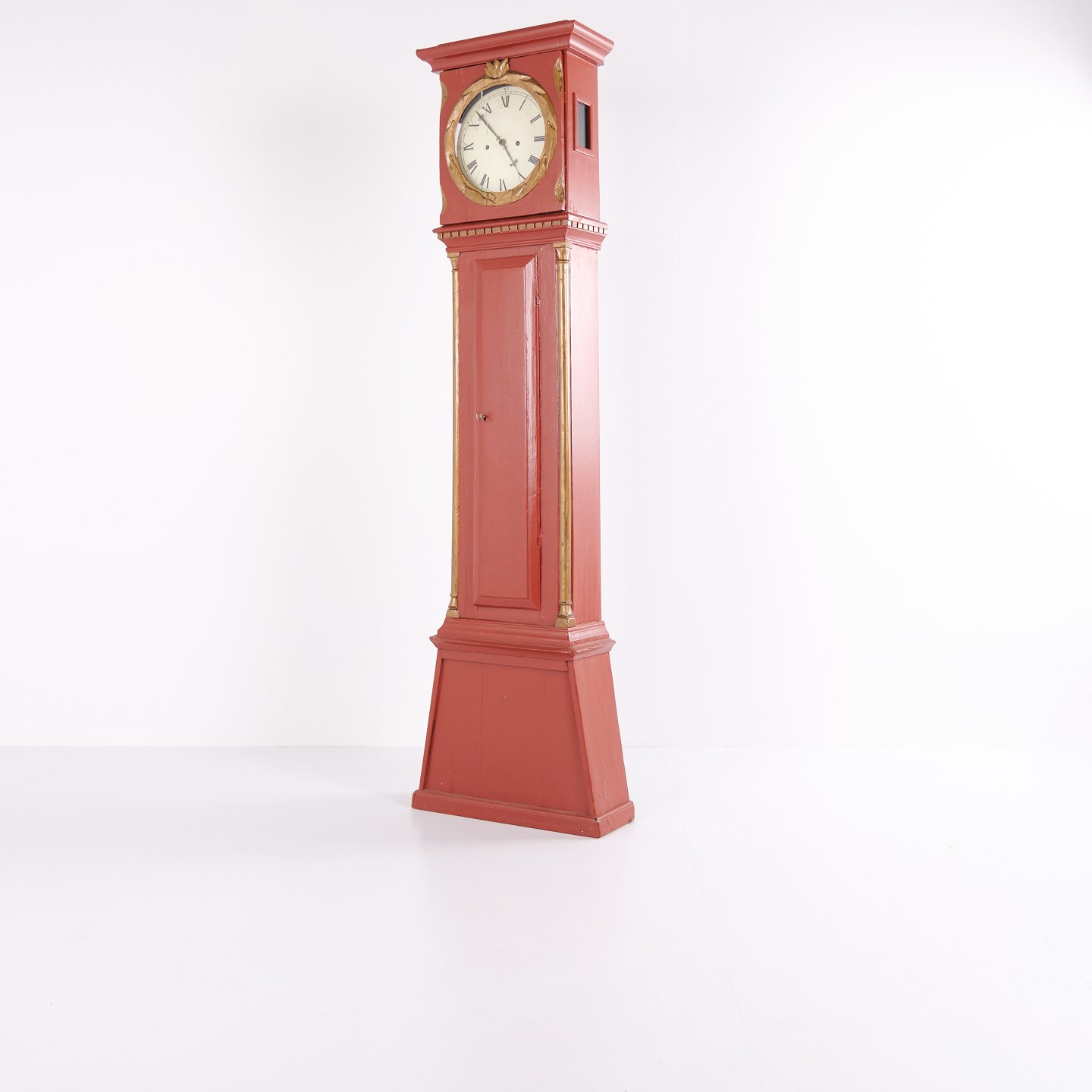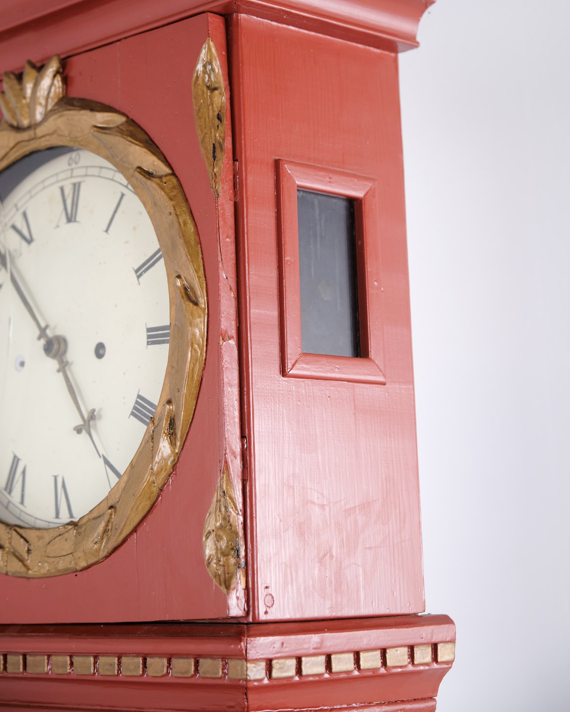 Bornholm longcase clock from the 1820s, red painted with decorative carved details and classic period styling. An original antique clock with strong character and authentic craftsmanship.