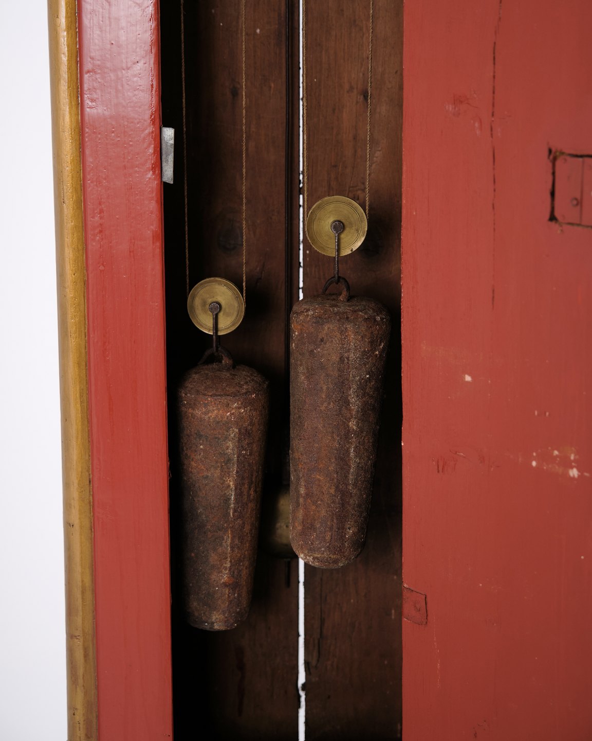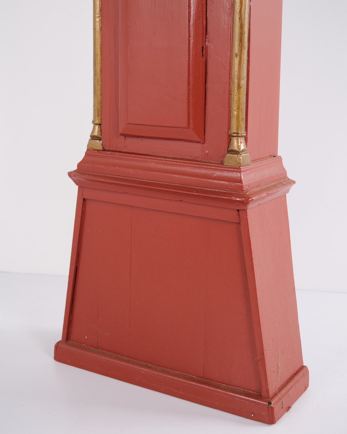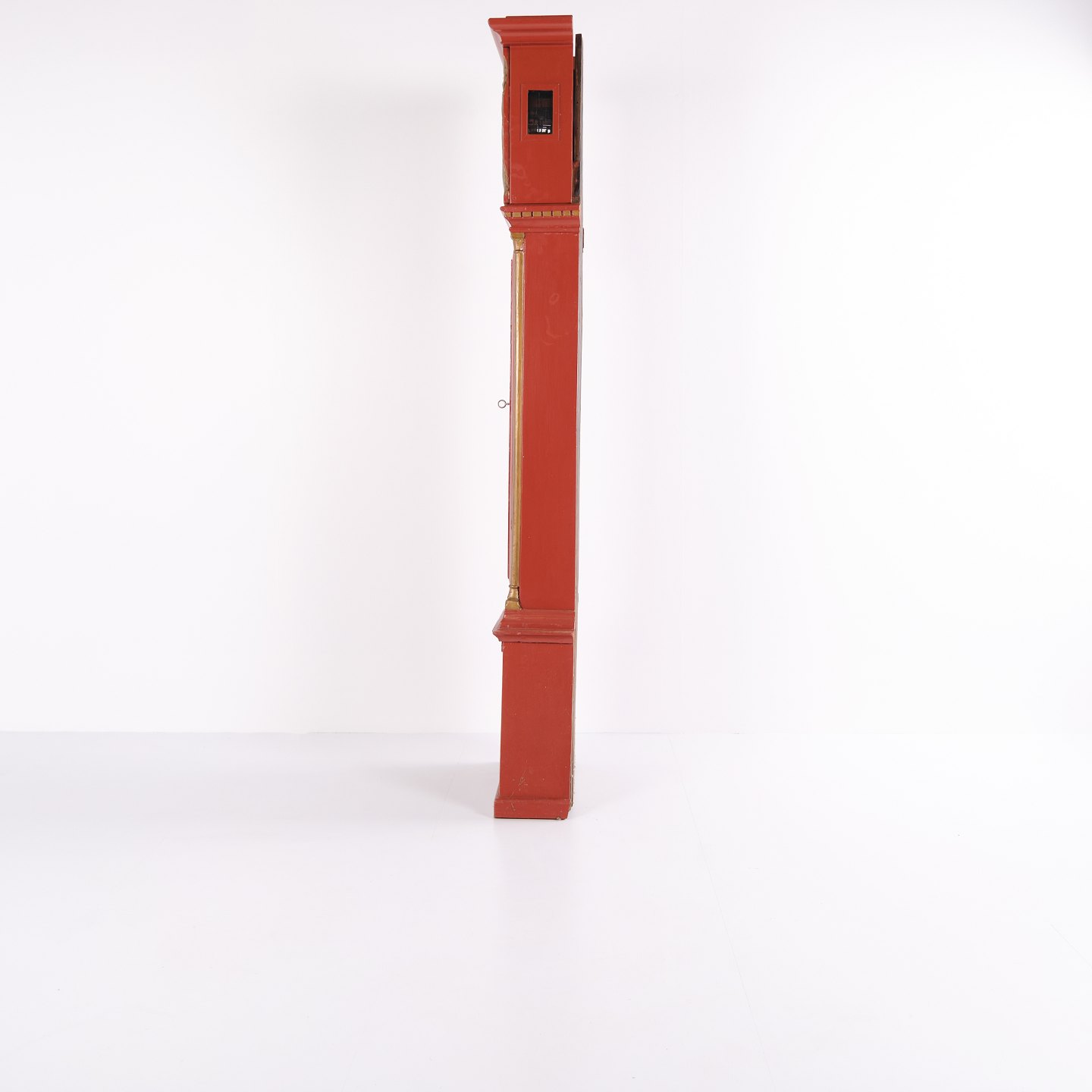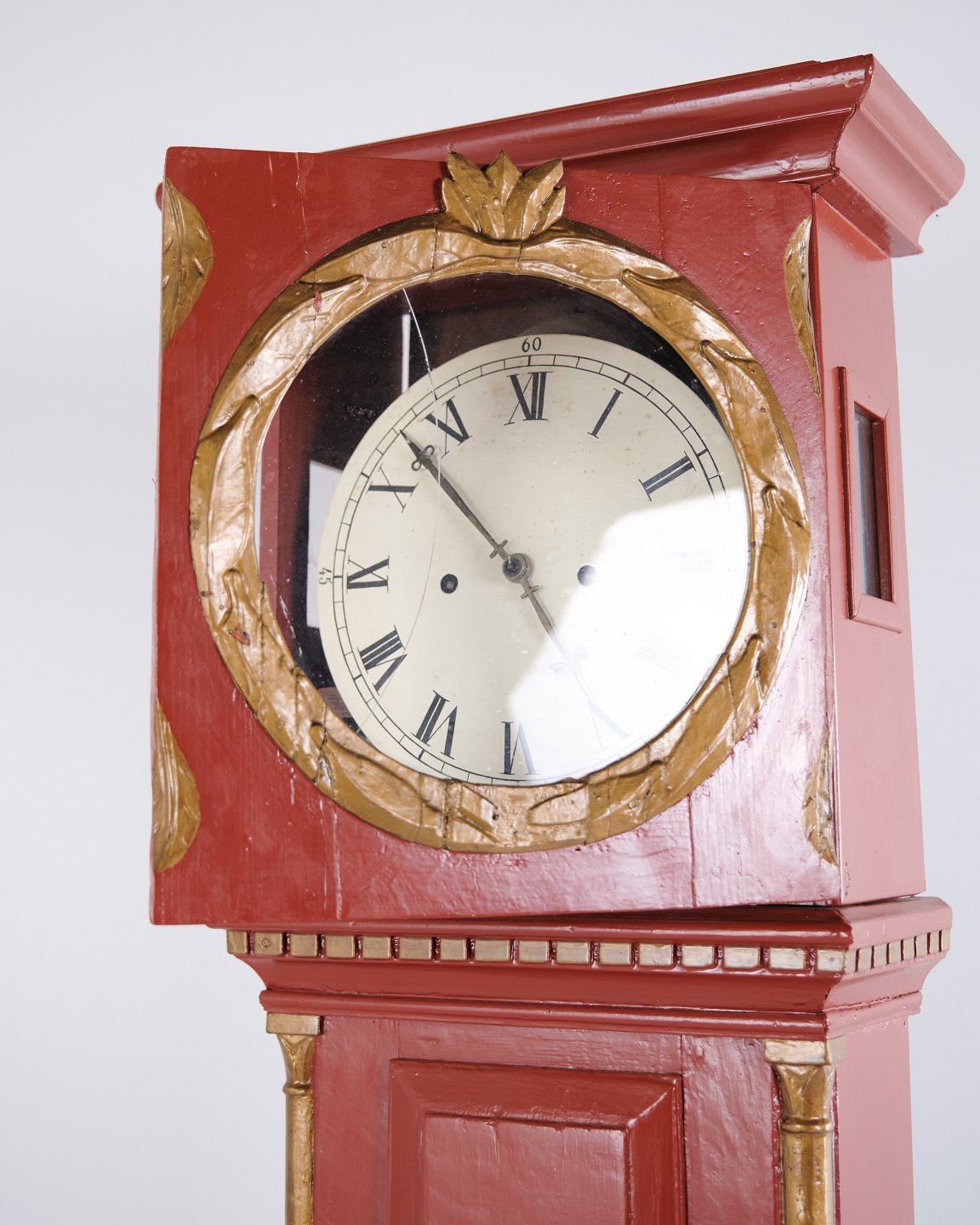 Bornholm longcase clock from the 1820s, red painted with decorative carved details and classic period styling. An original antique clock with strong character and authentic craftsmanship.