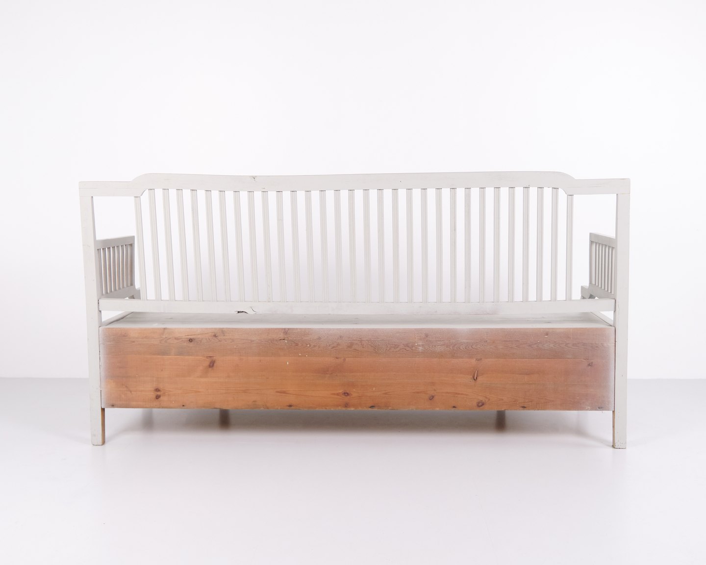 Antique storage bench from the 1860s in grey-painted pine wood with high back and storage. Antique storage bench from the 19th century.