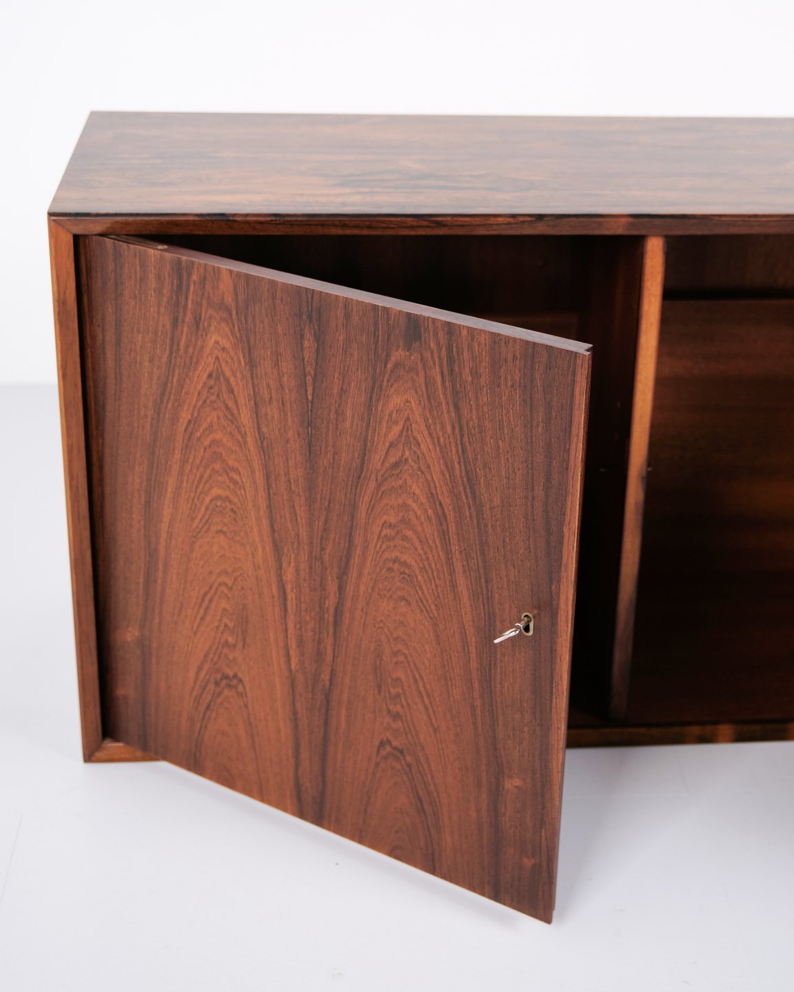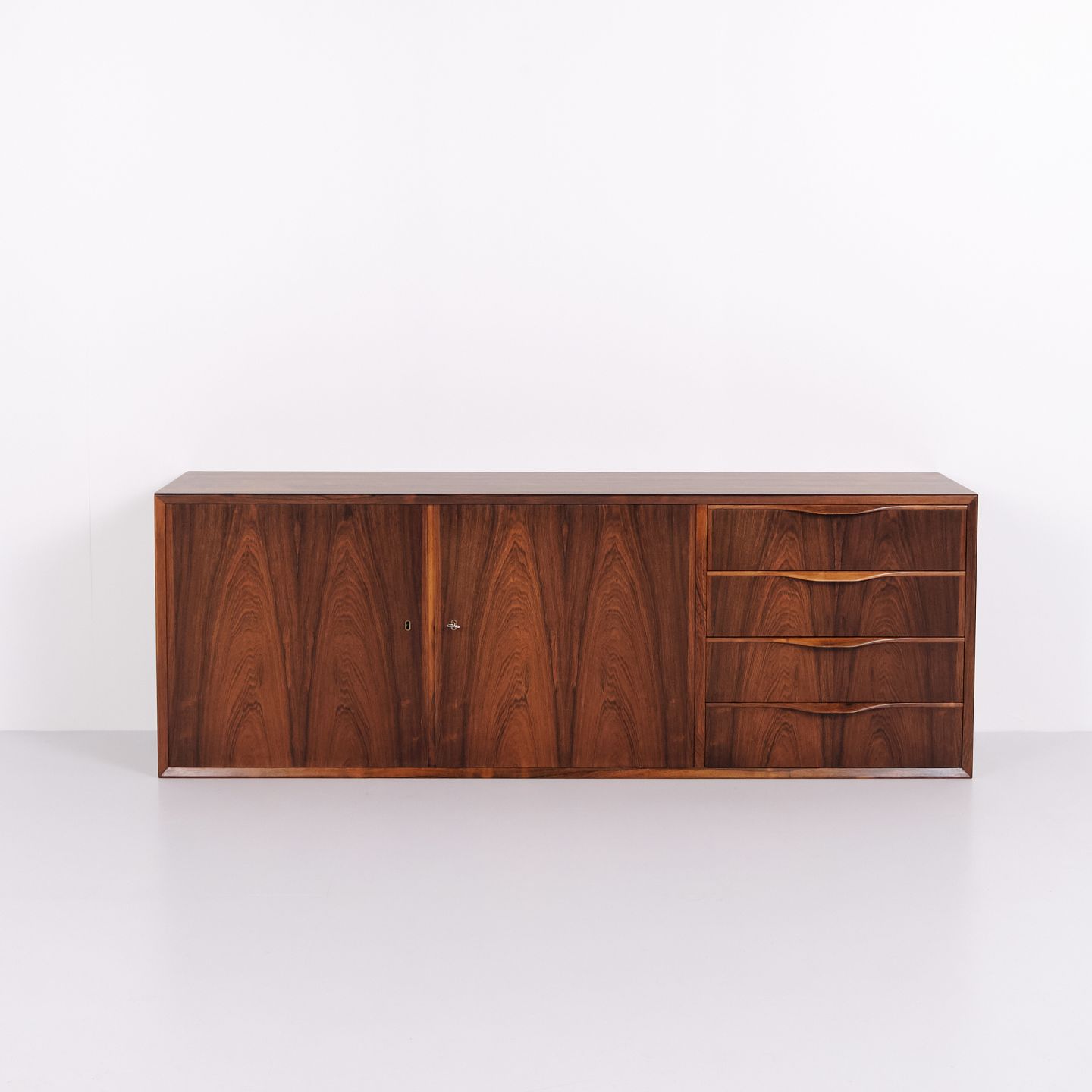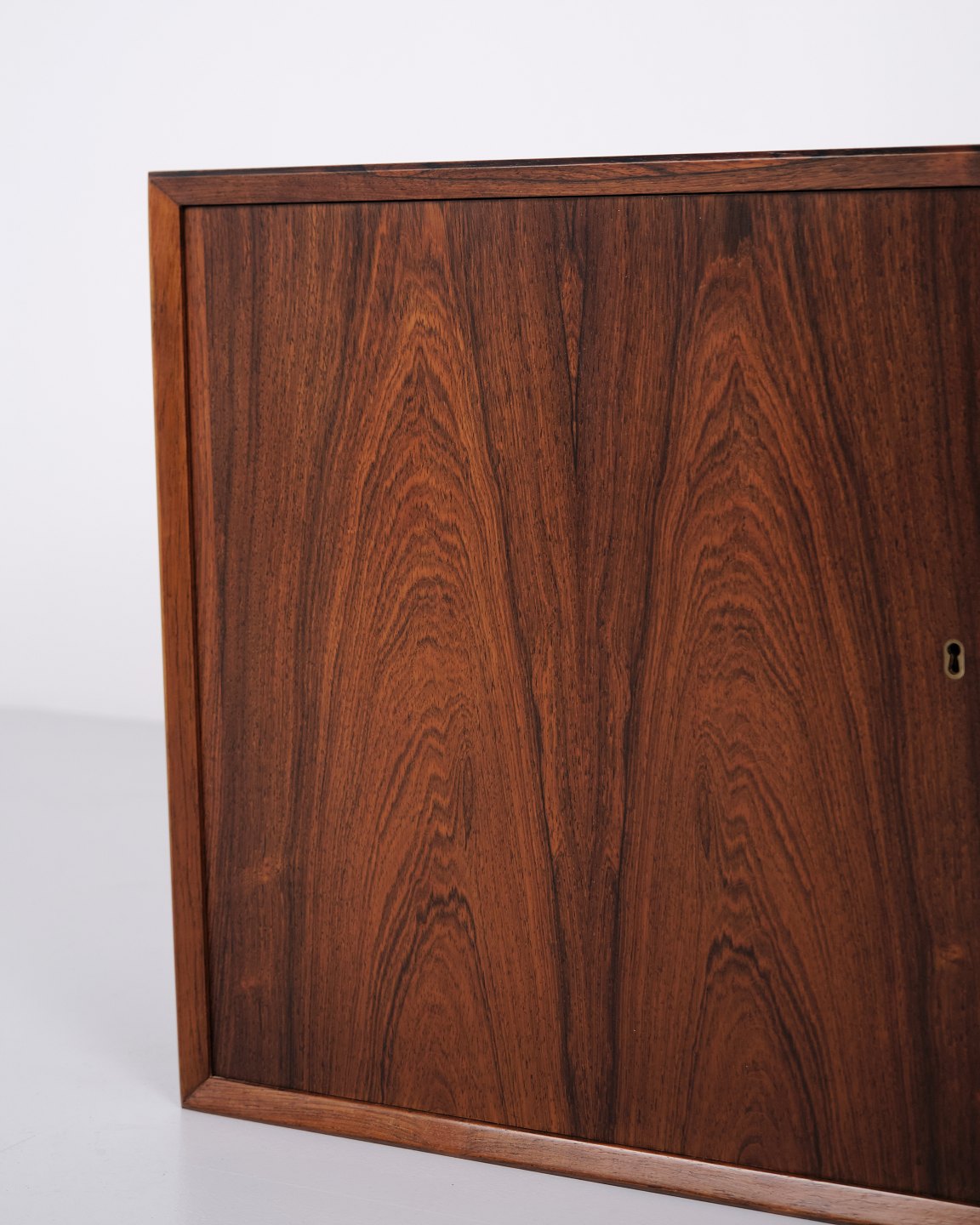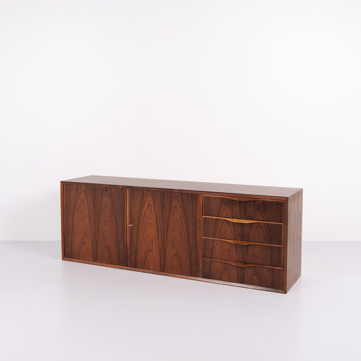 Wall-mounted sideboard executed in rosewood, designed by Erling Torvits and produced by Klim Møbelfabrik in the 1950s. The wall-mounted construction reflects functional Danish furniture design of the period and allows for a light, space-saving presentation. The use of rosewood highlights the focus on material quality and cabinetmaking.