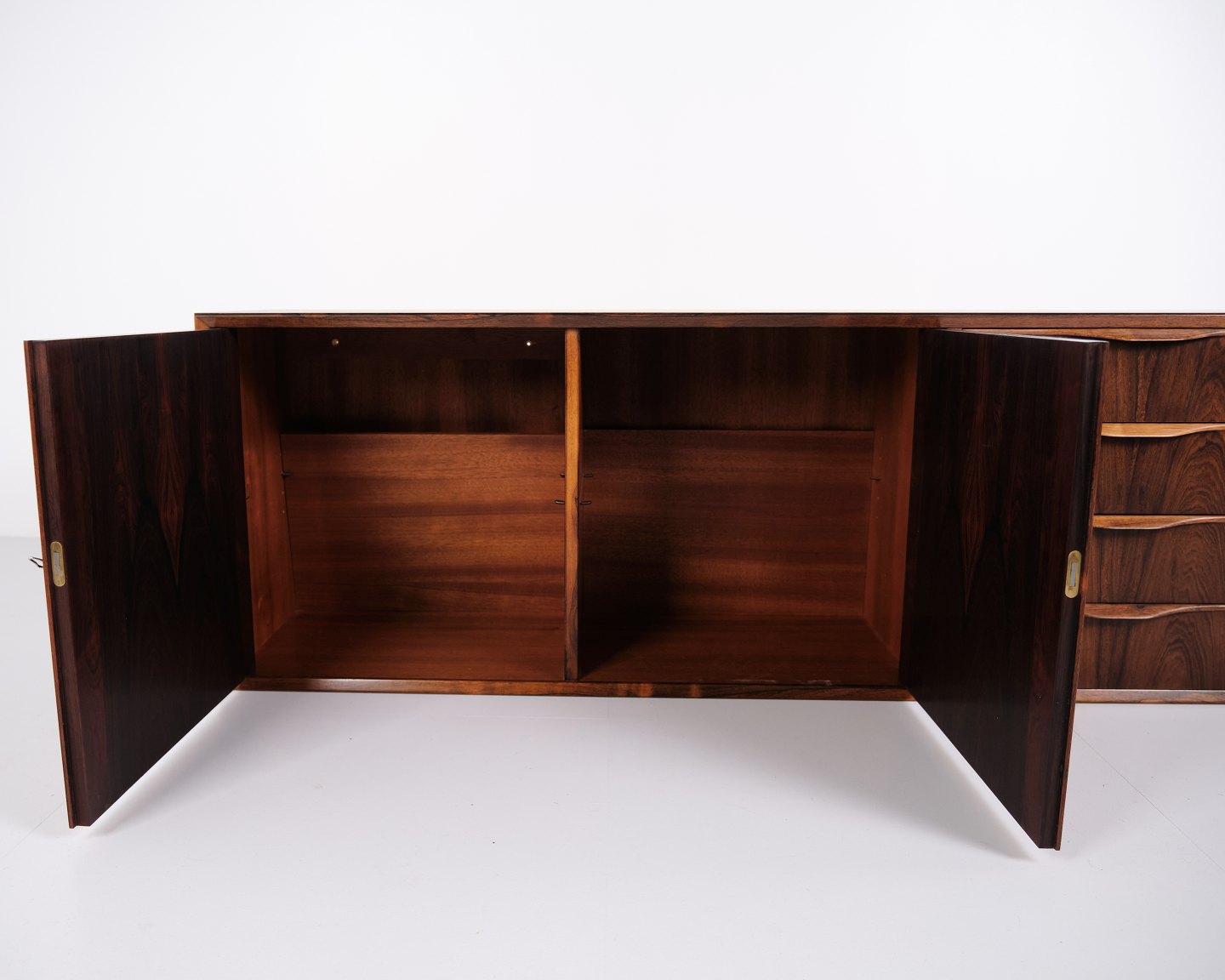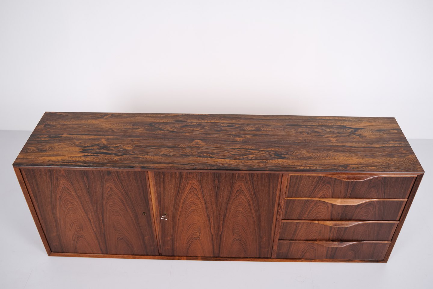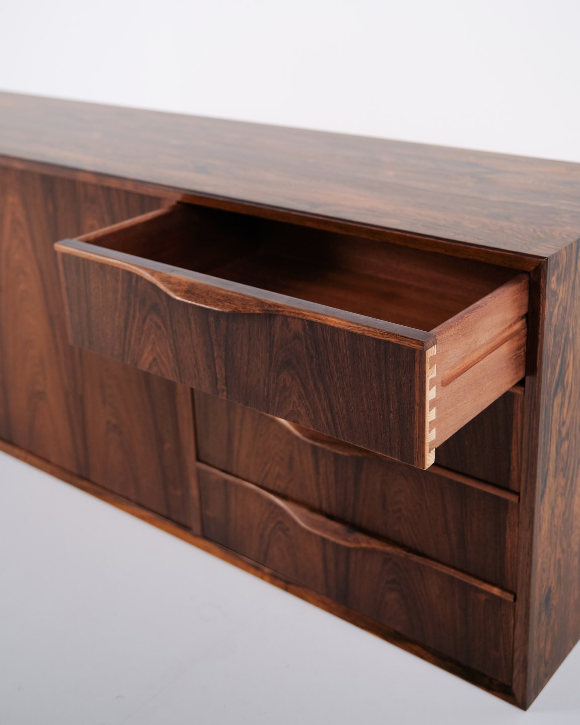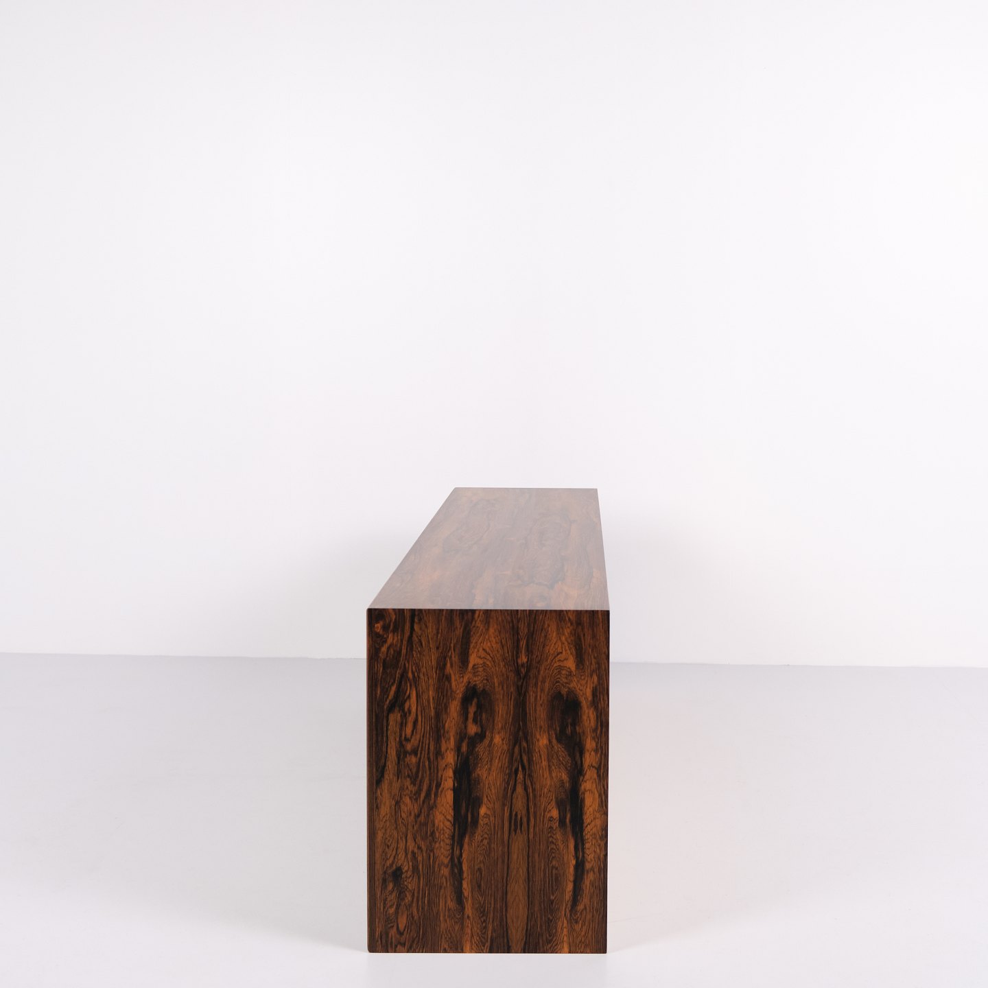Wall-mounted sideboard executed in rosewood, designed by Erling Torvits and produced by Klim Møbelfabrik in the 1950s. The wall-mounted construction reflects functional Danish furniture design of the period and allows for a light, space-saving presentation. The use of rosewood highlights the focus on material quality and cabinetmaking.