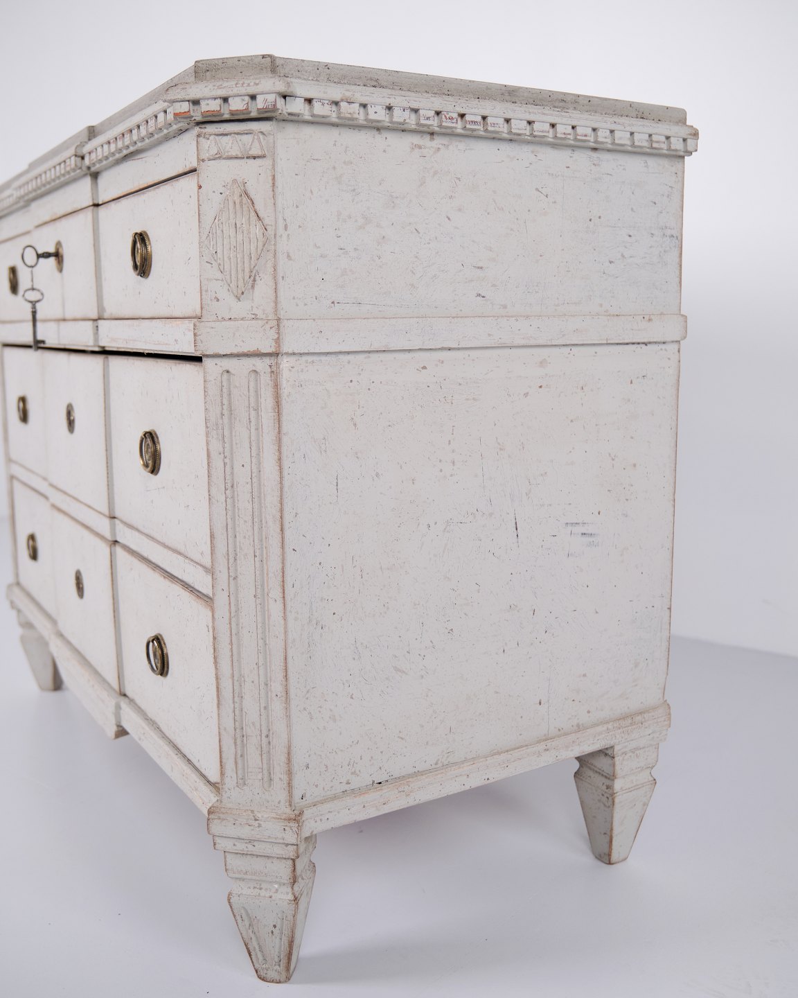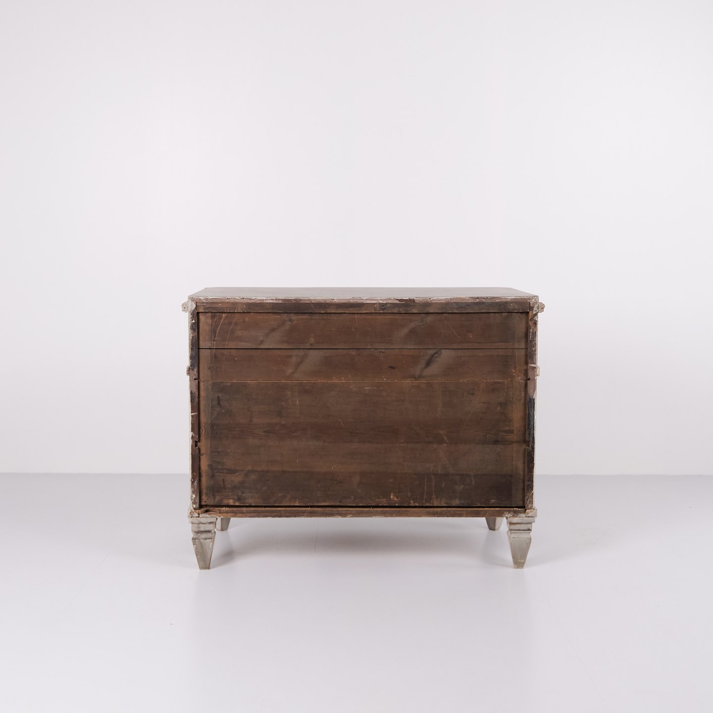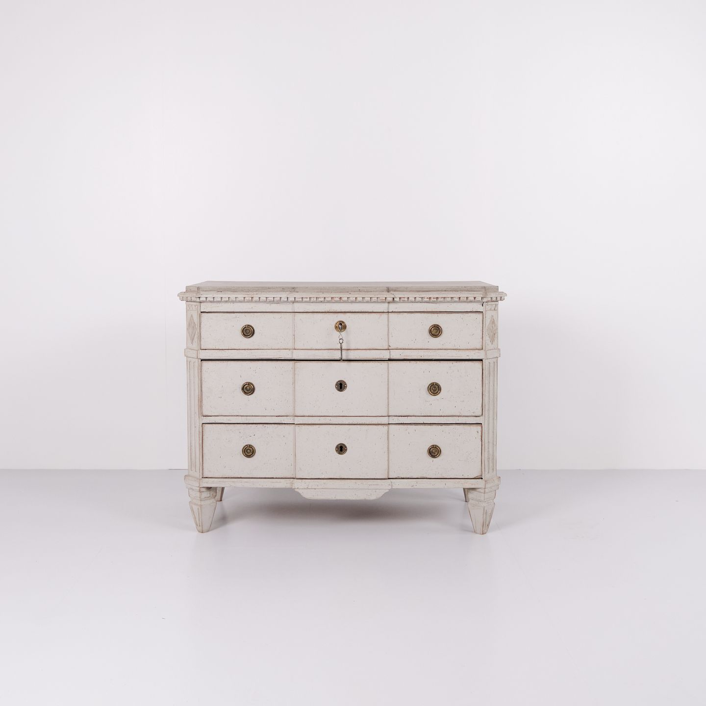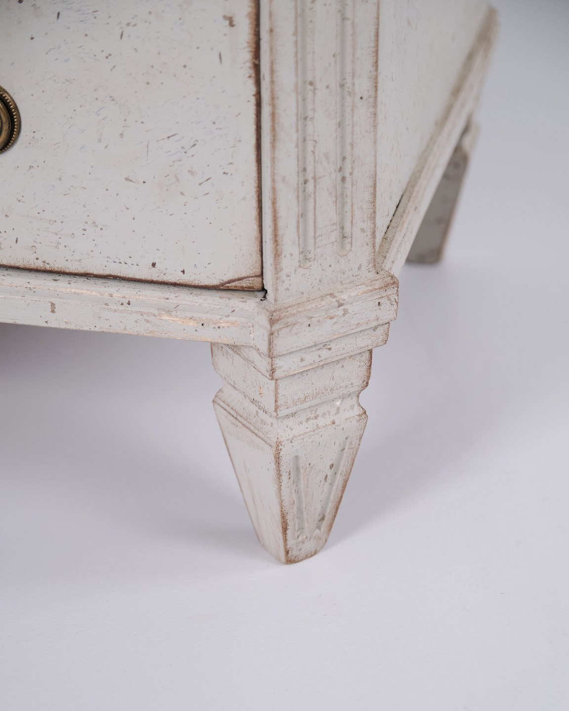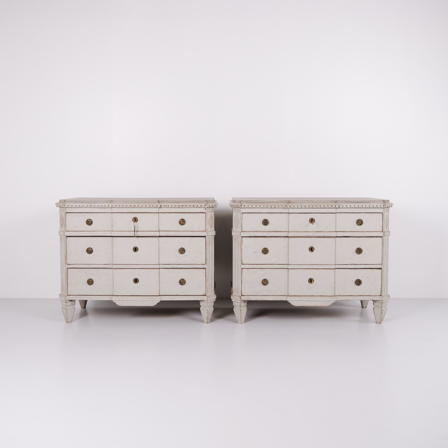 The chests stand on slender, tapered legs with fluting, giving a light and classic expression typical of the Swedish Gustavian furniture tradition. A decorative and timeless set with elegant craftsmanship and historical character.