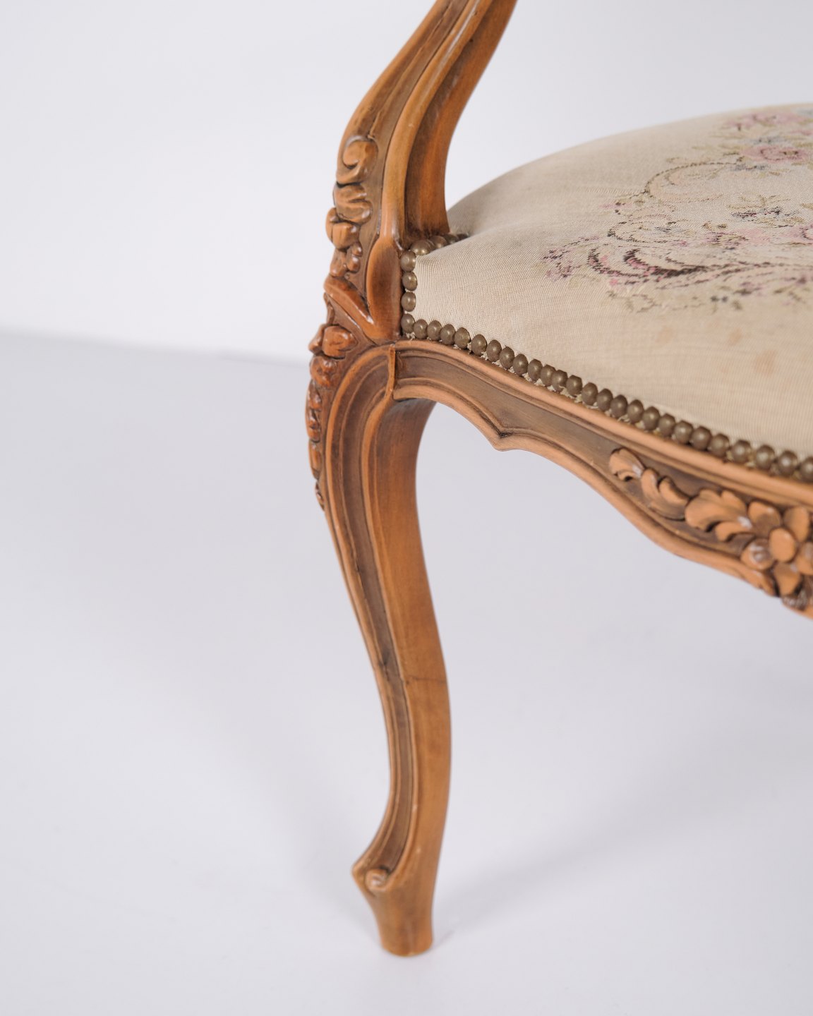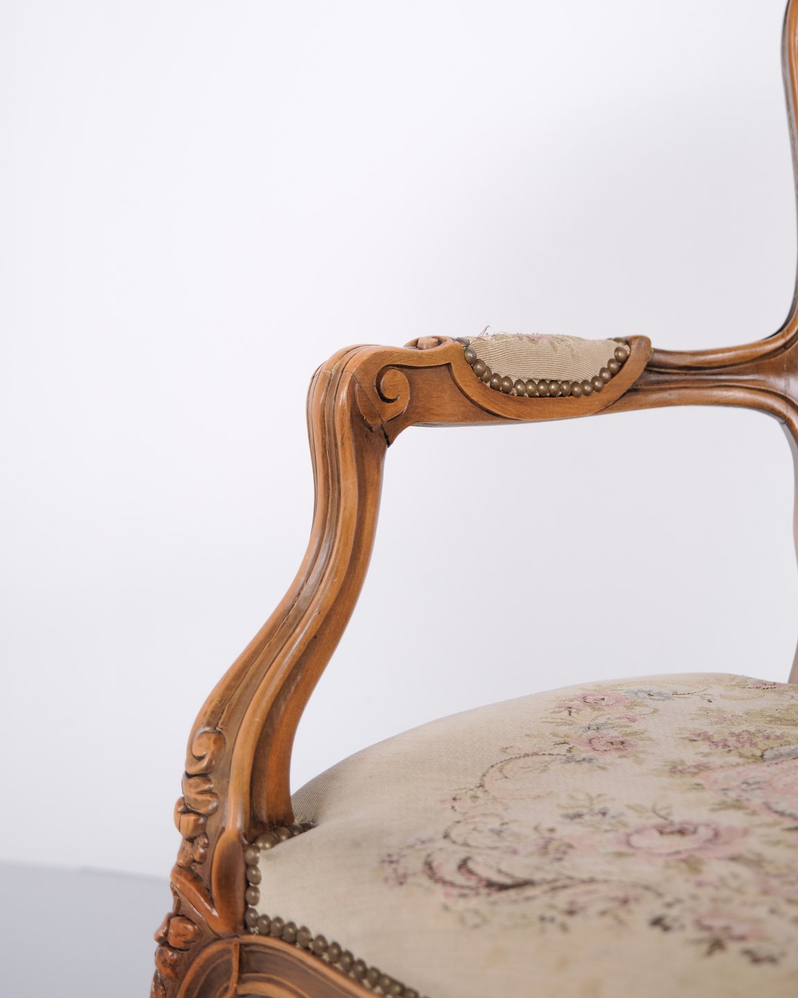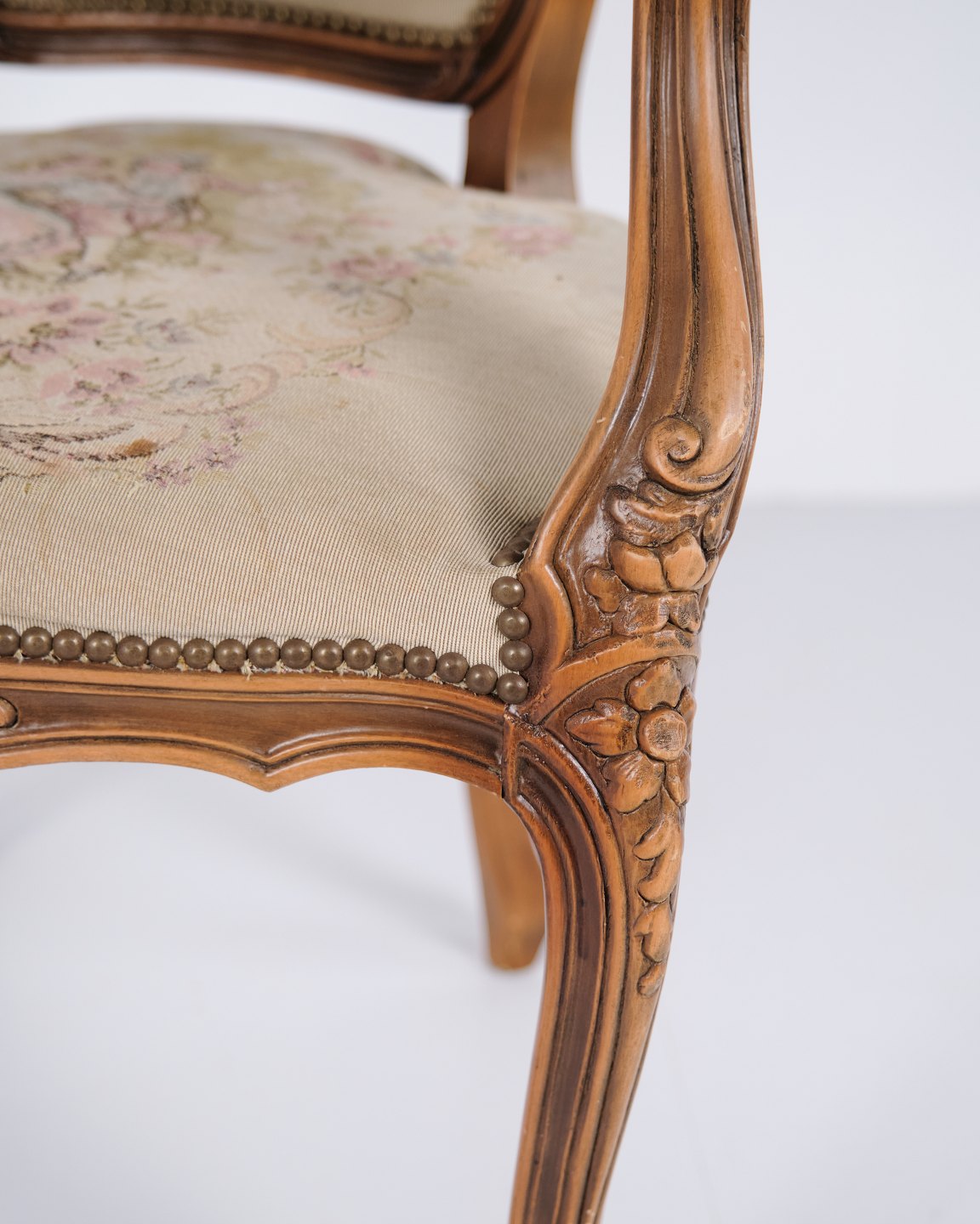 Neo-Rococo armchair from the 1930s with curved legs and patterned floral fabric. Classic and decorative piece of furniture in an elegant style.