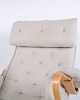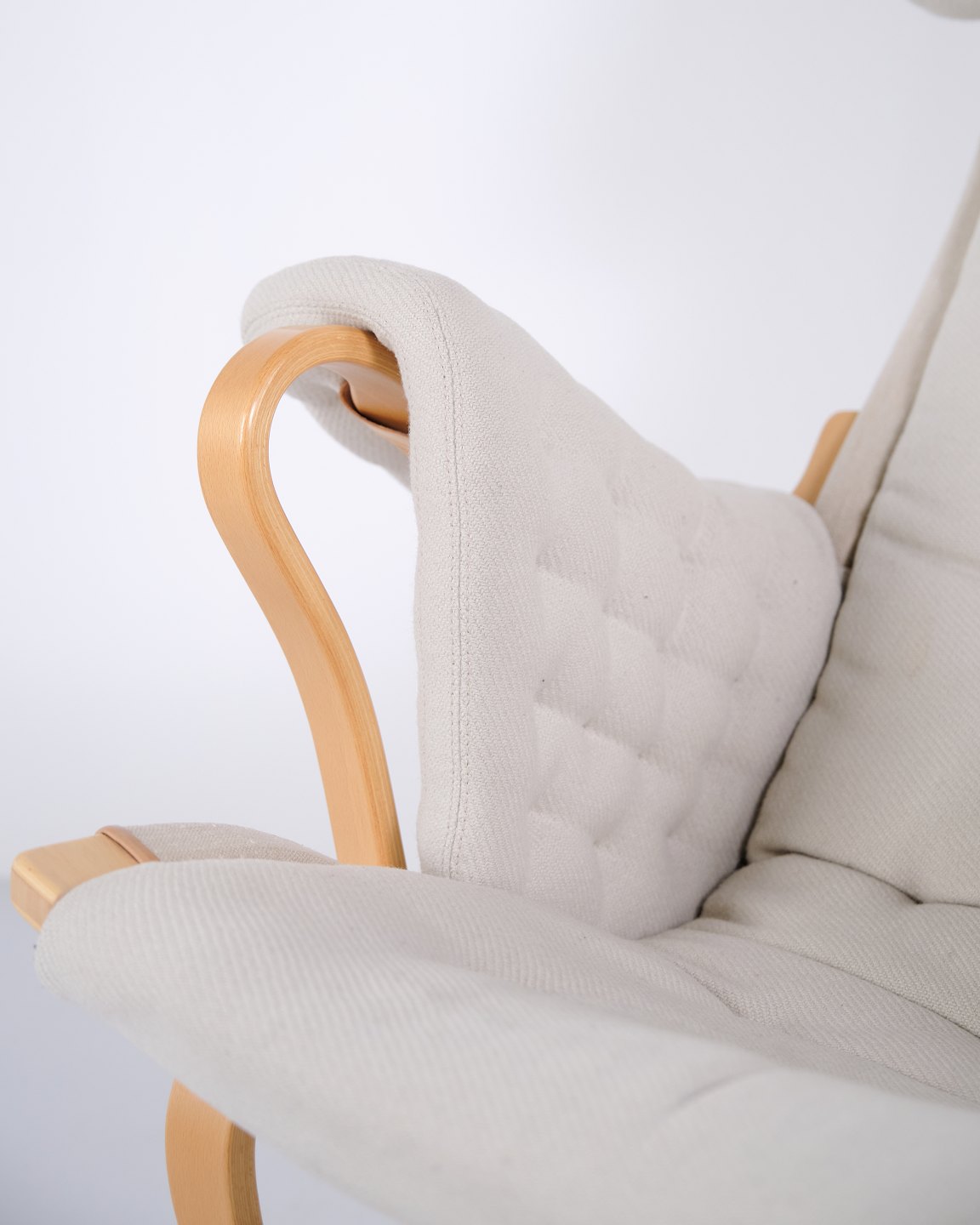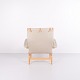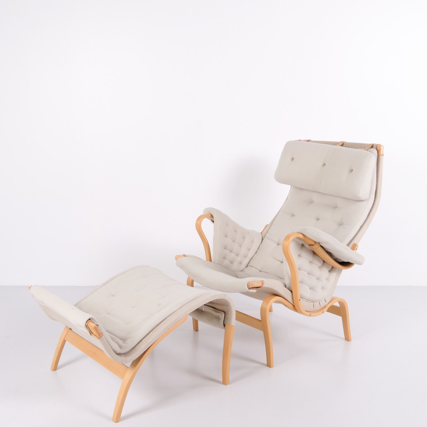 Pernilla armchair with matching footstool, model 69, designed by Bruno Mathsson and produced by DUX as a 35th anniversary edition. The chair is made of beech wood with light fabric upholstery and features a characteristic, ergonomic design that follows the natural curves of the body and ensures high comfort.