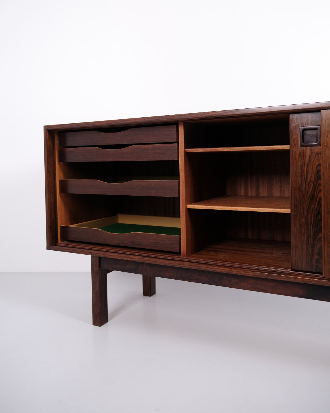 The sideboard features two sliding doors with recessed handles in solid rosewood. Inside are four pull-out drawers and shelves providing generous storage space, making the piece suitable for both living and dining areas.