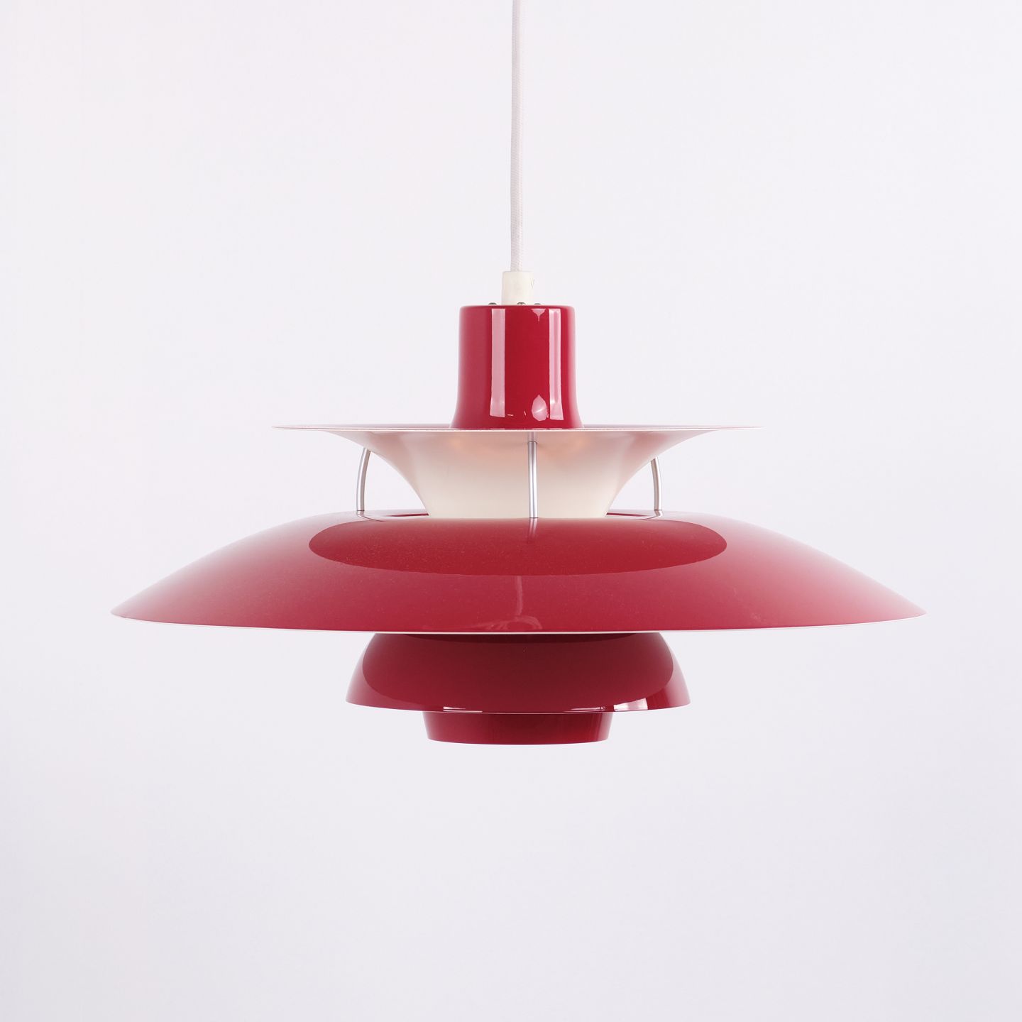 PH 5 pendant in red lacquered metal from Louis Poulsen designed by Poul Henningsen. Classic Danish lamp with glare-free and functional light.