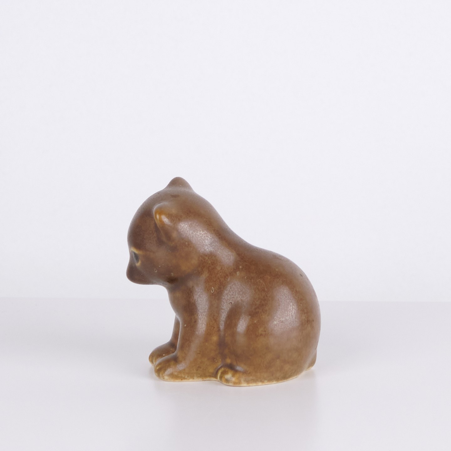 Bear figure by Knud Basse made in brown glazed ceramic. The figure shows a seated bear with lowered head, defined paws and soft forms. A smaller model from Knud Basse’s series of animal figures, produced in Denmark in the 1960s.