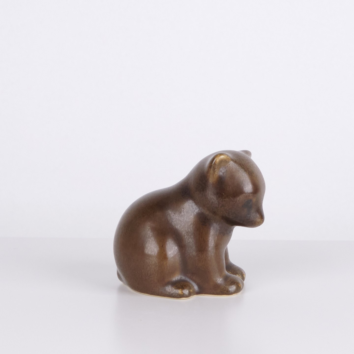 Bear figure by Knud Basse made in brown glazed ceramic. The figure is modeled in a seated form with slightly bent head and rounded lines, creating a calm and characteristic expression. A fine example of Knud Basse’s popular animal figures and Danish art pottery from the mid-century period.