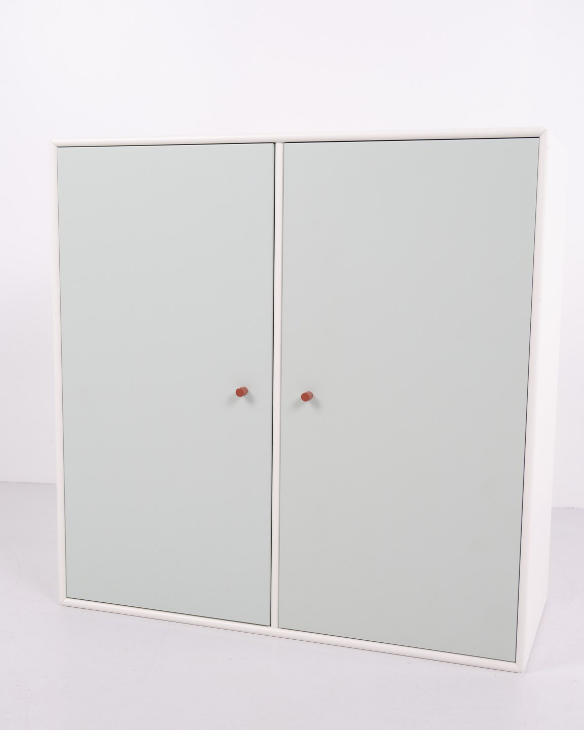 Montana cabinet module from the Montana System designed by Peter J. Lassen for Montana. Made of lacquered MDF with white корпус, two mint green doors and brown handles. Suitable as a wall cabinet, hallway unit or storage module. 2 pieces in stock.