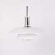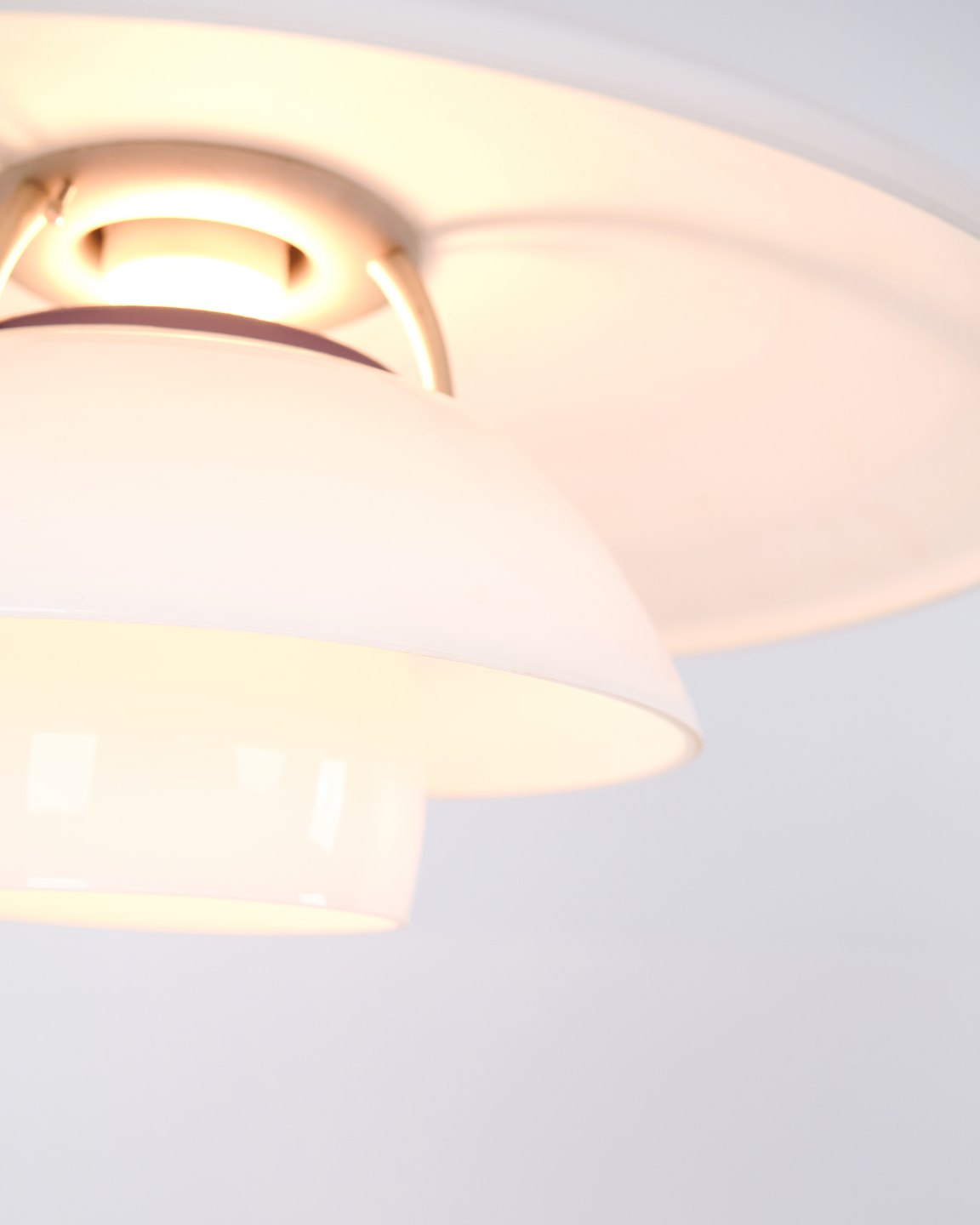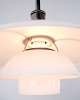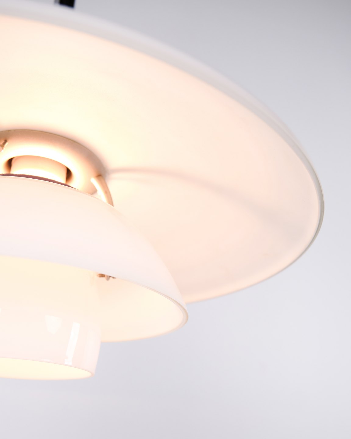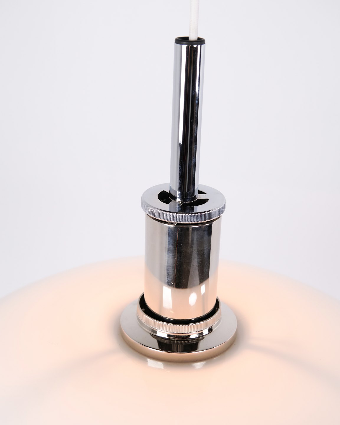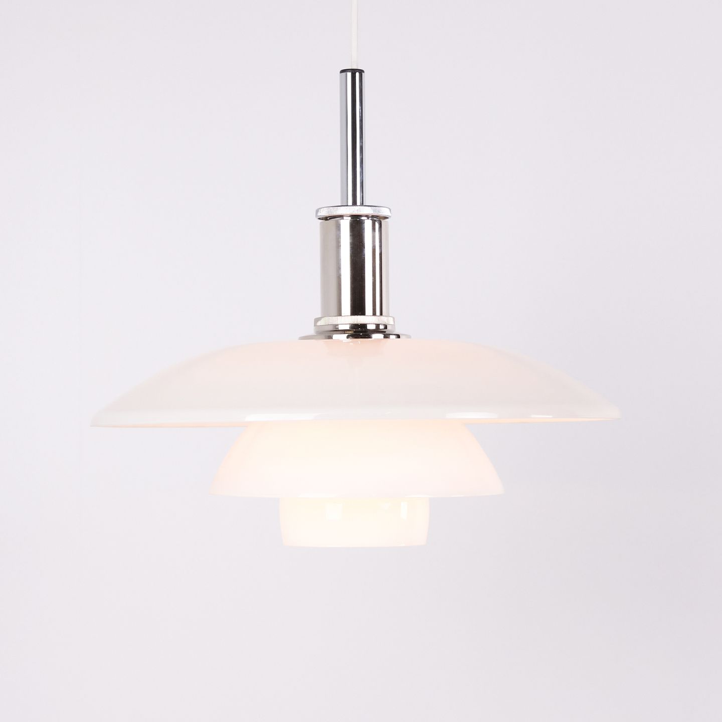 PH 4½-4 pendant designed by Poul Henningsen for Louis Poulsen. The lamp is made with hand-blown three-shade screens in white opal glass and chrome suspension. The model has a top shade of approximately 45 cm and uses the lower shades from the PH 4/4 series, developed to provide wider light distribution when hung low above a dining table or tabletop. The current version was introduced in 1980 and is part of the iconic PH glare-free lighting system.
